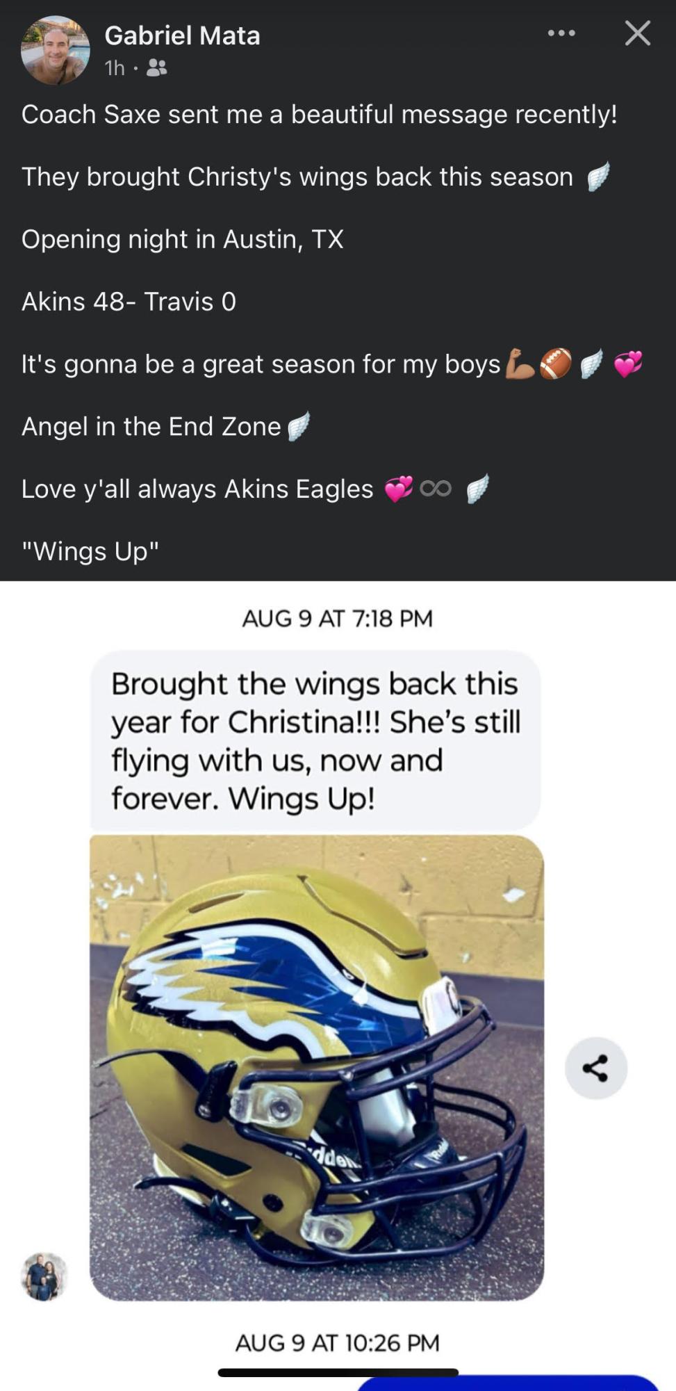 EE: Could you explain the meaning or story behind this year’s helmet design?Coach Saxe: Yeah, so we went back to the gold helmet, it was just a constant reminder that wewanna strive for excellence, and then the standard is what we said it to be in everything, both aca- demics, athletics, and community. Facebook post by Gabriel Mata, who was Garcia-Mata husband.We wanna have high standards for each other. And so just every time we see the goal, that’s what that is. The wings were my first design at the head coach, and it went back to just paying tribute to a great teacher, a great friend of mine, Christina Garcia Mata, and she was a very long-time educator here at Akins High School. And we lost her a few years back, in a tragic, just flash flood incident, in our hometown. And so we wanted to just give a nod to her and her family because of how much she had meant to me, in my develop- ment as an educator, but also how much she had meant to go kids.